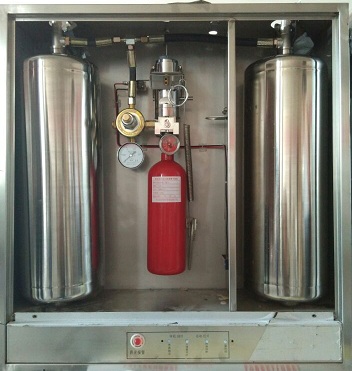 3、控制阀撞针冲破高压贮气瓶膜片释放出高压氮气经过减压阀对灭火剂贮存容器加压,使灭火剂通过雾化喷嘴喷洒到油锅及烟罩内,并与燃烧的油发生化学反应,形成覆盖层,隔绝空气,扑灭火焰,使其不复燃。